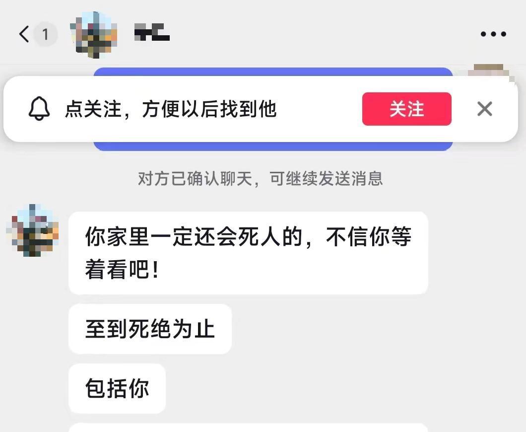 在悲伤之余,让代女士不理解的还有持续的网暴。代女士称,不少黑子只要她发视频,开直播就来骂她,还通过私信诅咒她。她提供的截图显示,相关暴力言论不少。代女士称,大多数网友都为家属鸣不平,她也非常感谢。